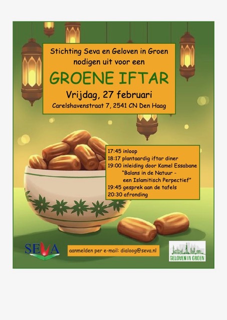 ![]() Stichting Seva en Geloven in Groen nodigen uit voor een GROENE IFTAR Vrijdag, 27 februari Carelshavenstraat 7, 2541 CN Den Haag 17:45 inloop 18:17 plantaardig iftar diner 19:00 inleiding door Kamel Essabane “Balans in de Natuur - een Islamitisch Perpectief” 19:45 gesprek aan de tafels 20:30 afronding aanmelden per e-mail: dialoog@seva.nl |
