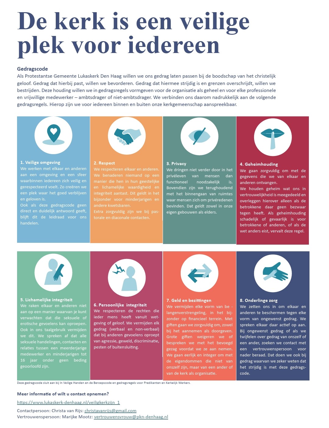 ![]() De gedragscode is vastgesteld door de kerkenraad. De Lukaskerk Den Haag wil een veilig buurt en kerkhuis zijn, een plaats waar mensen in vrijheid en vertrouwen samenkomen om te ontmoeten en te vieren. Voor een veilige gemeente zijn we samen verantwoordelijk. Met elkaar spreken we daarom deze gedragscode af. Voor iedereen binnen en buiten onze eigen gemeenschap zijn we hierop aanspreekbaar. Deze gedragscode is opgesteld ter bescherming van alle bezoekers van de kerk en dus ook ter bescherming van de vrijwilligers zelf. Deze gedragscode geldt voor alle vrijwilligers op elk terrein van het kerkenwerk Deze gedragscode wordt bij de benoeming of aanstelling aan de vrijwilliger overhandigd en met haar/hem besproken. De vrijwilliger wordt tevens geïnformeerd over het beleid veilige gemeente. De vrijwilliger verklaart zich door de acceptatie van de taak c.q. functie akkoord met de inhoud van de gedragscode vrijwilligers en het beleid veilige gemeente Hier leest u de volledige tekst |